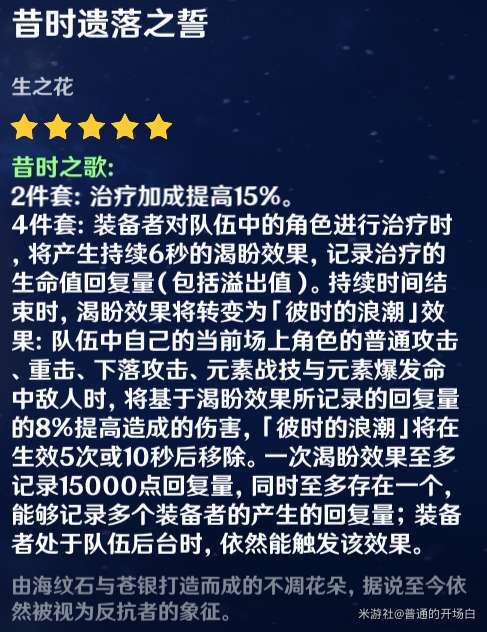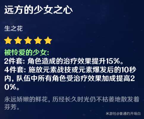描述:此套装加成为2件套的治疗效果提升与4件套的治疗效果再此提升。可以让迪奥娜元素爆发领域内的奶量大管饱,配合迪奥娜的元素战技,可轻松缓解队内奶量问题。