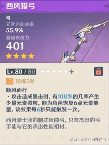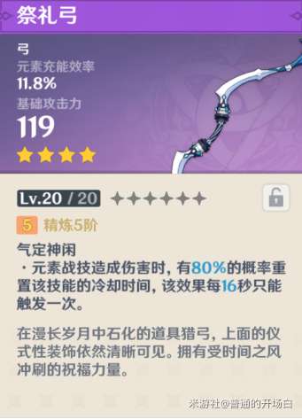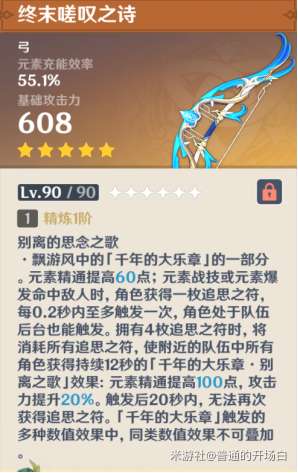 描述:武器的触发效果为队友带来攻击力的提升与元素精通的提升,可搭配迪奥娜的六命在短时间内为队友带来元素精通300+。持续时间内让元素反应的伤害提升。