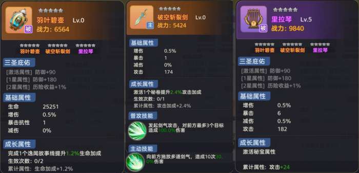 选择【里拉琴】,可以看到该【秘宝】拥有的三圣庇佑、属性及属性增幅。