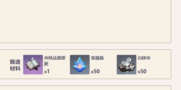 央陆法器原胚x1、萃凝晶x50、白铁块x50。