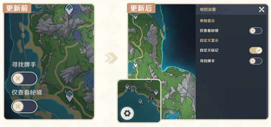 4.6版本更新后,新增地图设置页面,玩家可以在设置中调整地图标识,比如牌手、秘境、自定义标记等。