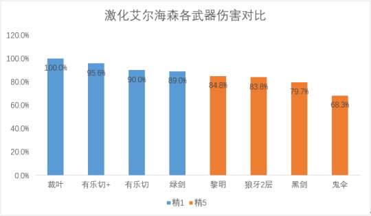 可以看到,激化海森即便不触发有乐切的翻倍增伤,也能有绿剑水平,触发之后则是可以达到专武之下第一的水平,仅比专武差4.4%,可以说还是挺适配海森的,想要补强海森又没有专武的玩家可以考虑获取一把。