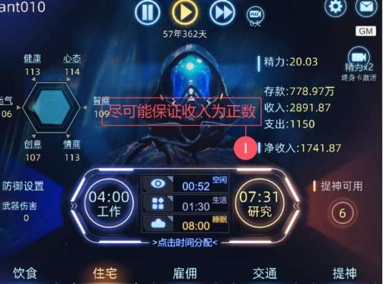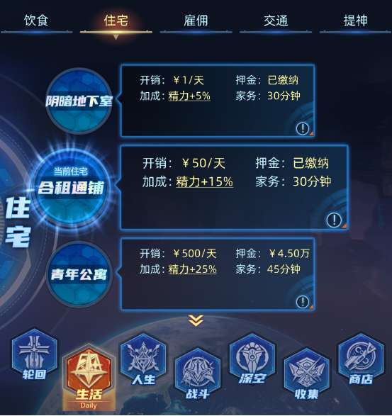 5.当收入足够,可以在住宅、饮食、交通、提神(注意提神是有时效性,CD过了以后要手动续上)等地方更换,获得更好的加成