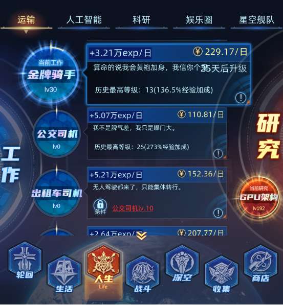 4.过程中可以升级工作,增加收入,高级工作达到特定条件会自动解锁