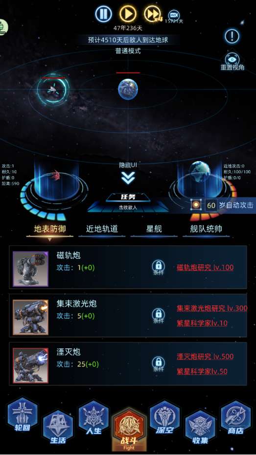 8.敌人的出现和星球沦陷:敌人将在40岁准时出现(第一次为39岁),敌人出现后不会直接攻击地球(第一次除外),60岁时开始攻击,地球防御力初始默认100,归0后游戏将进入轮回。