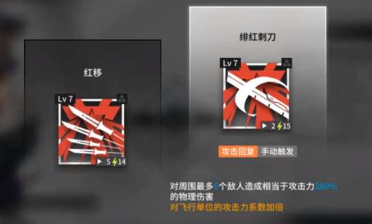 对周围最多6名敌人造成物理伤害,相当于攻击力的380%,飞行单位的攻击力系数加倍。