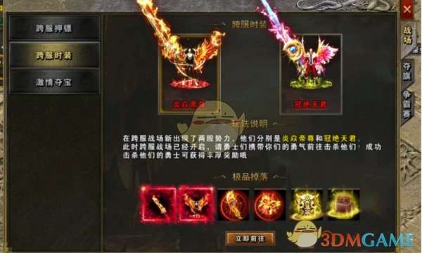 游戏中可以在活动时间内进入跨服战场击败BOSS有几率获得极品时装奖励