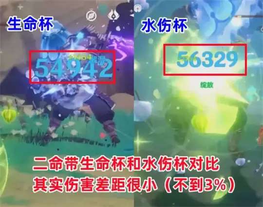 如果你的芙宁娜是二命,触发了二命效果后,可增加最多21430点生命值上限(140%是根据基础生命加成计算得出)。加上芙宁娜自身的生命值,总共差不多是4万。有趣的是,二命芙宁娜选择生命杯或水伤杯没有太大的差别,实际测试中,在其他条件均相同的情况下,水伤杯的最高暴击伤害为5万6,而生命杯则是5万4,差距不到3%。选择哪个取决于词条的选择。
