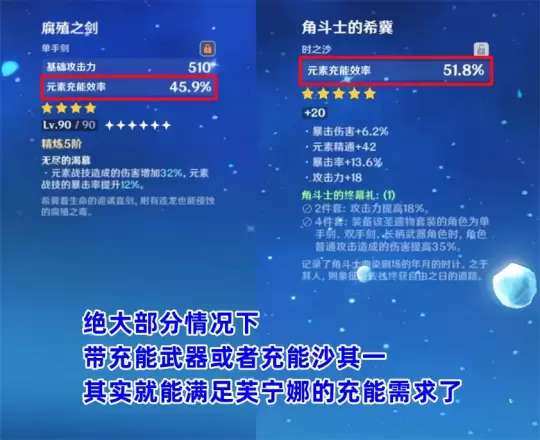 如果你使用的是双水组合,那么只需要装备一件充能武器或者使用充能沙即可获得接近60%的充能效果,无需过多关注副词条的充能属性。相反,尽可能地选择带有双暴或生命加成的装备。