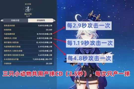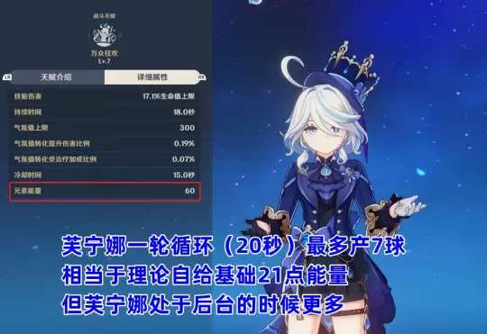 小动物的产球机制比较复杂,简单来说,假设每20秒为一个循环,每轮能够产出6到7个球。理想情况下,基础自给能够提供21点的能量,但芙宁娜的大招需要60点能量才能释放。此外,芙宁娜会更多时间待在后台,后台吃球所得到的能量只有前台的2/3,因此充能会更为困难。