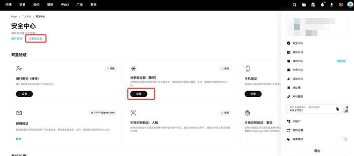 在“安全中心”页面,点击谷歌验证器或“设置”继续。
