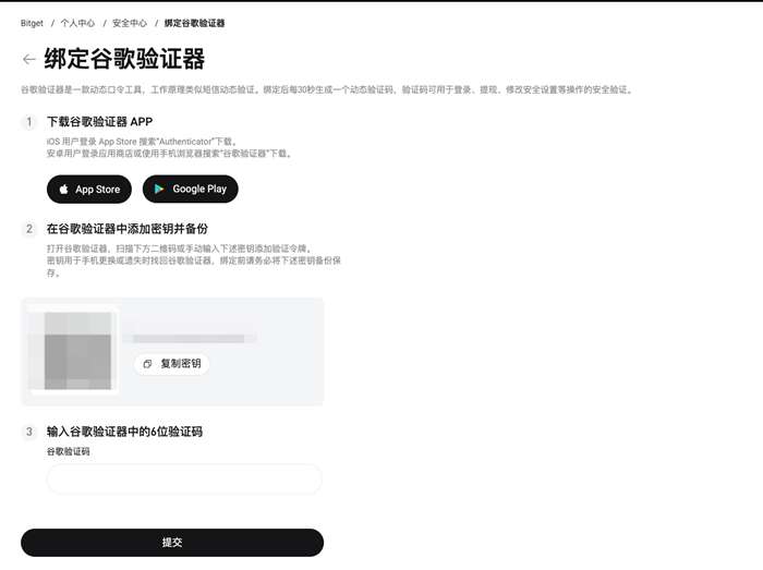 注意:如果您的 Bitget 应用和谷歌验证器在同一设备上,扫描二维码可能会有困难。建议复制并手动输入安装密钥。