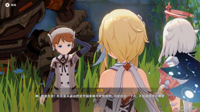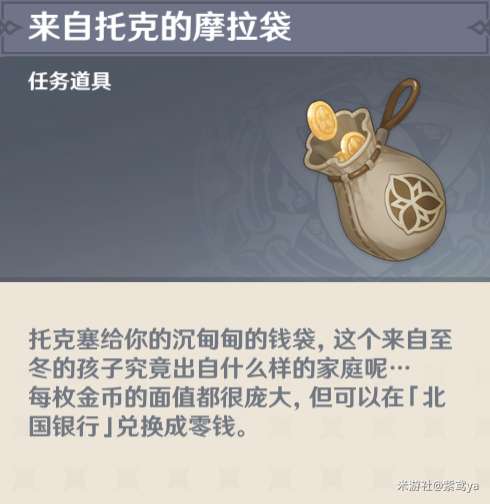 击败遗迹守卫后在附近继续调查,接着会在另一座遗迹守卫旁发现一位小朋友。对话得知他是来自至东国的托克来璃月寻找自己的哥哥。对话结束后会获得一个来自托克的摩拉袋