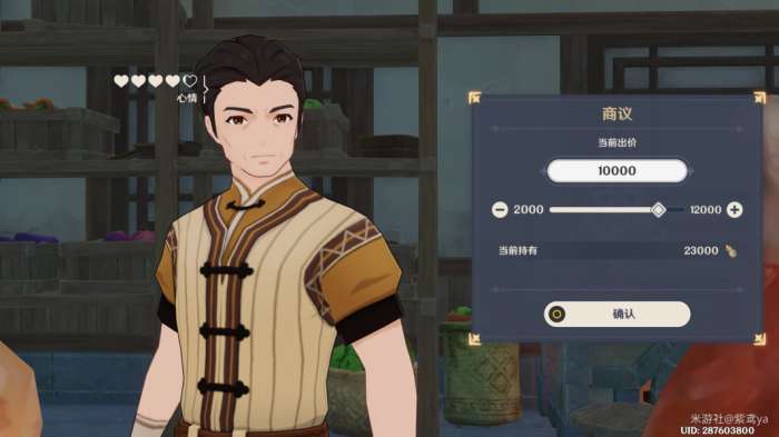 买完风筝后前往万民堂和卯师傅对话定制美食,价格可商议为10000摩拉