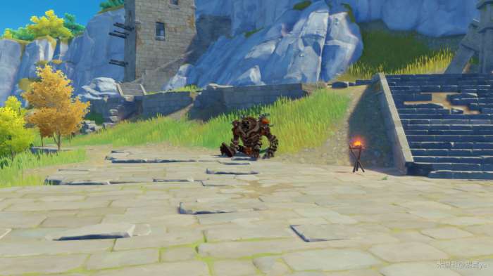 沿着脚印找到了一座遗迹守卫,然后靠近遗迹守卫将它击败