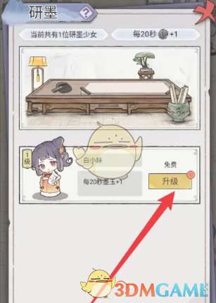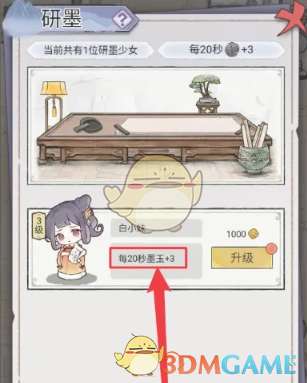 3、研墨少女详情页,点击后面的升级,可提高墨玉生产速度,升级后,从每20秒墨玉+1升至+3。