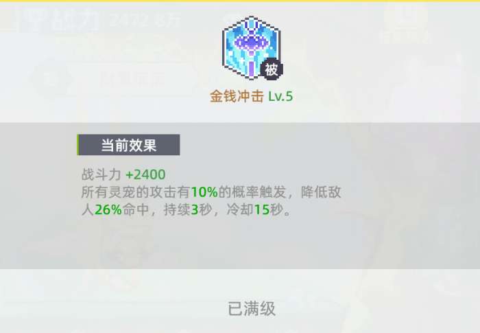 别小瞧被动金钱冲击!灵宠攻击 10% 概率触发,降敌人 26% 命中(持续 3 秒),15 秒冷却持续干扰战局。 PVP 针对依赖连招的对手,多次触发让其技能疯狂 MISS;PVE 打高攻速 BOSS,叠加触发变相提升生存,搭配减伤体系,把 “理财防御” 拉满,让敌人输出如同 “花钱打水漂”。