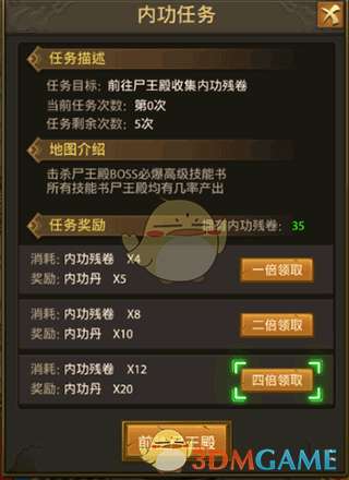 1、玩家可在内功任务NPC处进入内功任务,一天有5次次数;