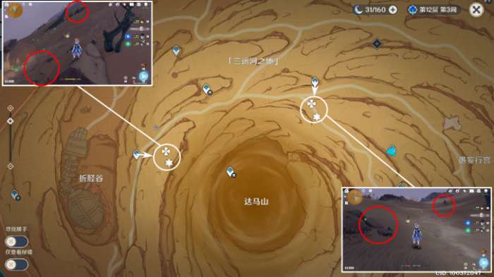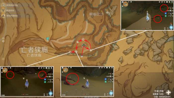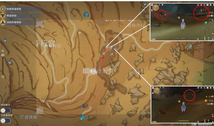 2、沙虫隧道,这里面一共二十七个,从传送点进入洞窟,找到一个摩拉堆交互会出现一个沙坑跳下去来到下层,路程较长,位置如下图。