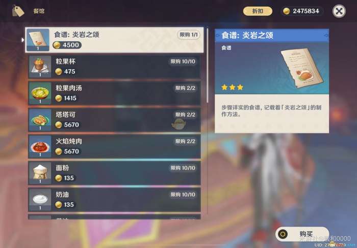 3、最后在商店内,找到炎岩之颂,花费摩拉币购买即可获得食谱;