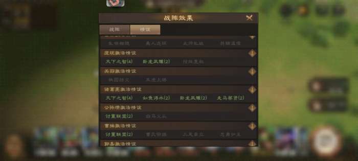 情义方面有郭嘉/庞统/诸葛亮/荀彧 天下之智4%精神 刘备/诸葛亮 如鱼得水10%幸运 庞统/诸葛 5%增伤。