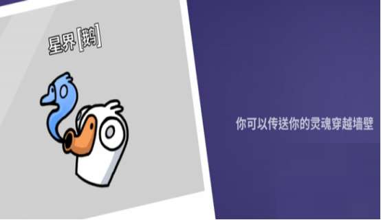 鹅鸭杀星界使者拥有的技能非常独特,首先第1个最大的技能那就是灵魂出窍了,而且这种技能还可以持续8秒以上,玩家如果在和其他阵营正在相互较量的过程中,那么就可以释放出这种独特的技能,在此过程当中具有超强的穿墙透性,可以成功穿透墙壁查看周围的环境,还可以在特别关键的现场,比如凶杀现场,将周围的对话全部窃听,从而盗取强有力的信息。虽然此技能拥有超高的作用,但是整体的移动速度相对来说特别缓慢,那么在使用前提之下必须要做好合理的规划。