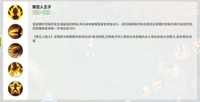 贝吉塔的被动技能包含两个效果。首先是与等级相关的经验获取加成:当他的等级不是全场最高时,会获得10%的经验获取提升。若游戏中存在孙悟空(队友或对手均可),且贝吉塔的等级不高于孙悟空,则此加成会提升至15%。这一机制鼓励玩家积极比较等级差,主动争夺资源以保持等级竞争力。第二个效果是死亡惩罚与增益:贝吉塔首次阵亡时,复活时间会增加5秒,但之后每次阵亡都会永久增加15点攻击力,最多可叠加10层(总计150点攻击力)。这一设计既防止了无脑送人头,又为他提供了后期carry的资本。实战中,需要谨慎选择阵亡时机如果低端局,小编推荐前期第一时间偷偷送塔。