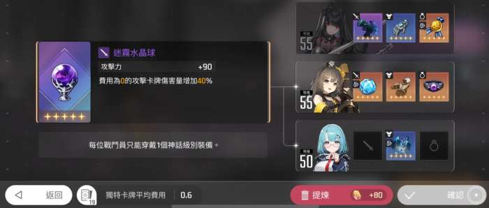 包括其中2命的入鞘最后丢出去的话也是0费的,所以在这里琳要搭配武器的话,大家可以带水晶球,因为水晶球是目前0费的卡组当中含金量最高的一个搭配,也不是梅铃这个角色主要的一个专属武器,放在这里的话,琳进行装备的时候要注意,前期如果已经有紫色的装备的话,是无法进行更换的,所以要搭配水晶球给琳的话,一定要提前留下一个转手的位置,如果是防御道具上面大家可以为琳搭配的是自由之翼,这样的防具给琳带来的一个加伤效果是比较符合整体的能力。