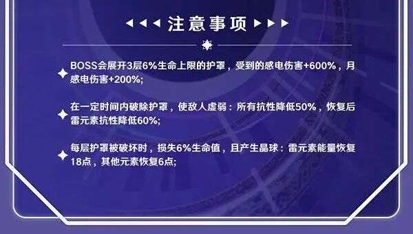 整体看下来可以说基本上是点名菲林斯、伊涅芙两位主打月感电伤害的角色了,不过比岩居蟹好一些的是,这个护盾利用其他类型的伤害也可以比较轻松地破除,因此配队上的选择会多一些。同时每层护盾破除后会掉落6单位雷元素能量球,对一些比较卡能量的队伍来说是一个不错的优化。