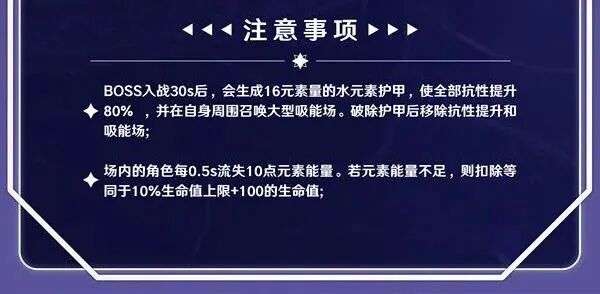 如果不破盾等它自己结束机制,会提高70%全抗并且触发一个高伤攻击,需要用大招无敌帧去规避,因此一般情况下不推荐不带水草角色走机制硬打,容错率极低的情况下还有很大的输出压力。