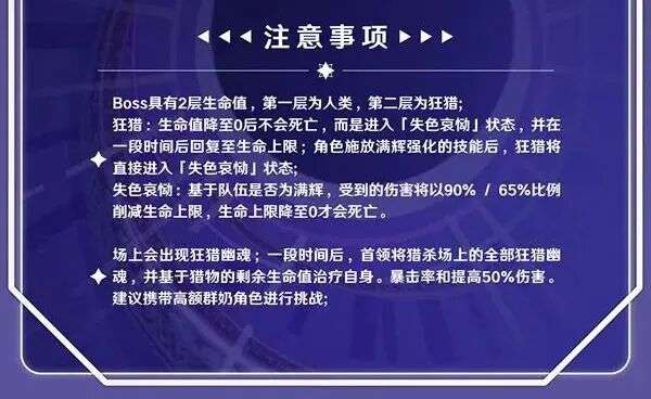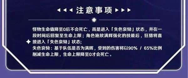 同时,变为狂猎形态后,西格德在“失色哀恸”状态下一段时间后会回满血量(回到当前生命值上限),非满辉队伍就需要再打回复上来的这一部分血量,而满辉队伍只要释放满辉强化的技能(例如爱诺q、菲林斯小q、奈芙尔重击)就可以继续正常降低boss的生命上限。
