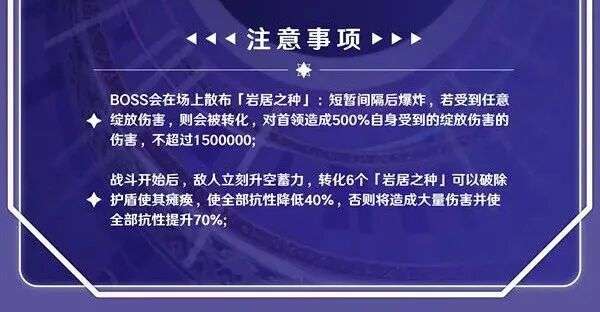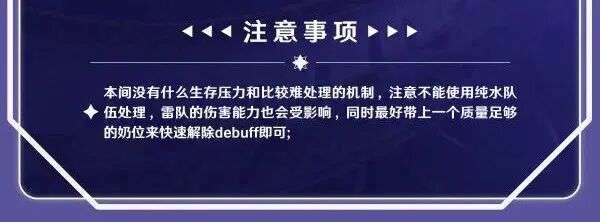 总的来说本间没有什么生存压力和比较难处理的机制,但是会卡一个元素要求,不能使用纯水队伍处理,雷队的伤害能力也会受影响,同时最好带上一个质量足够的奶位来快速解除debuff,诸如奈芙尔月绽放队伍、老牌的妮绽放/草行久队伍基本上都可以无视全部机制无脑打。