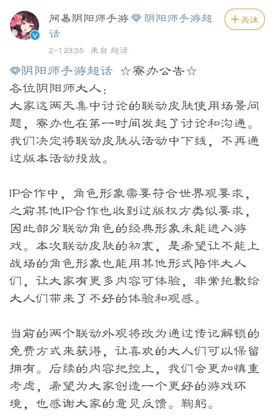 争议一出,阴阳师官方紧急回应,将此次联动外观获取方式改为传记解锁的免费方式,下线联动皮肤。并表示是由于版权方要求,认为此次皮肤是居家装扮,不适宜在战斗中出现,所以有了战斗中变回默认皮肤的设置,不过玩家对这个理由并不买账。