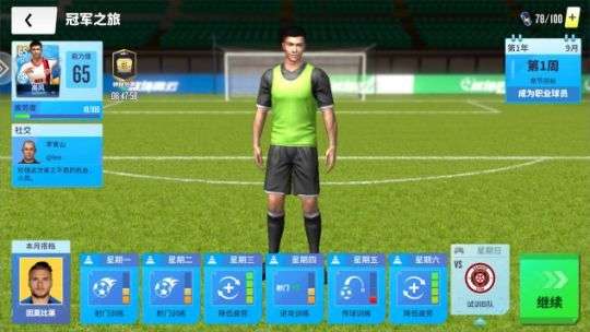 先来安排好一周的训练,前三天是系统引导,后面3天玩家自主安排,最后一天则是比赛日。这时候需要把高风放置到主力阵容里,才可以继续进行。才过一个星期,数值就长了1点,看来用不了多久就能超过梅罗了,果然是主角。
