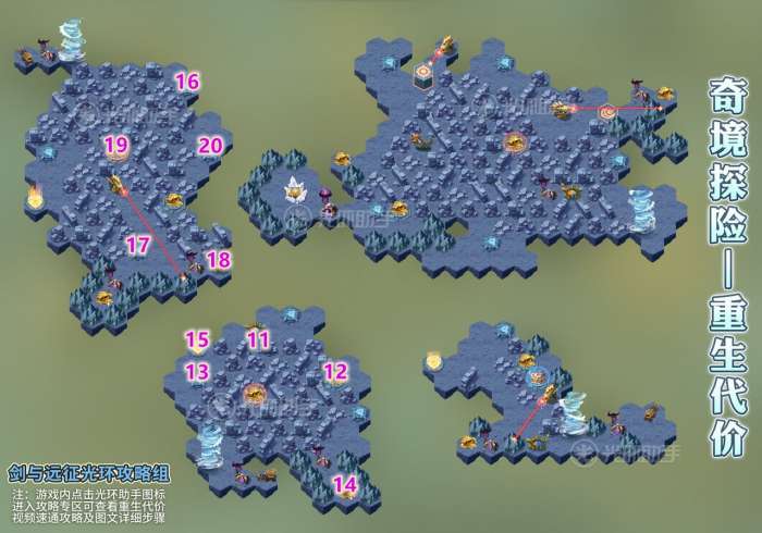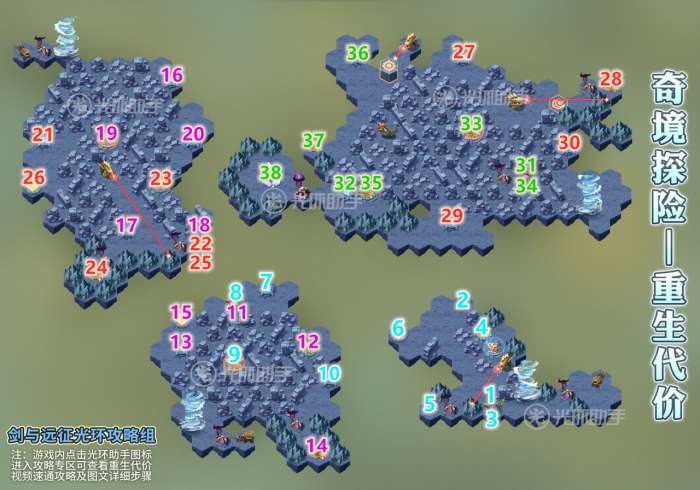 重生代价是国服奇境探险的第三十一个副本,正式服于5月21日上午8点开放。重要奖励有占星券*10、家具币*1500、升腾秘符选择箱*10、原初秘符*20、增幅秘符*20,紫色灵魂石*30,蓝色灵魂石*120,装备重铸券*2 以及若干金币、经验、粉尘。本次副本难度中等偏下。下面是重生代价 的速通攻略,分为三个部分,地图导航攻略和图文详解攻略以及精英怪打法建议。