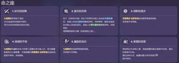 七域舞步的翩转状态下的第三段舞步命中敌人后,将为妮露恢复15点元素能量,并使妮露的浮莲舞步远梦聆泉造成的伤害提升50%,持续8秒。