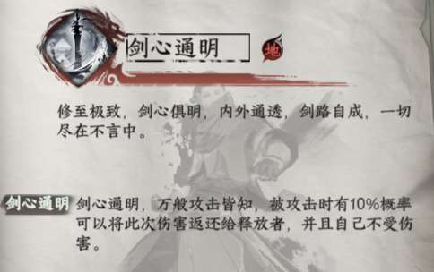 剑心通明,万般攻击皆知,被攻击时有10%概率可以将此次伤害返还给释放者,并且自己不受伤害。
