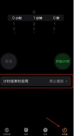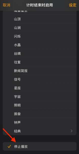 3、选择结束动作:点击「计时结束时启用」,滑动至底部选择「停止播放」,点击「设定」保存。