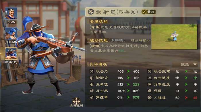 构建弓兵队时,兵种建议优先选择武射吏,这个兵种在普攻时概率击退,并且可额外提高普攻暴击率。甘宁提供连击后,我们可以通过普攻更高频的触发暴击伤害。