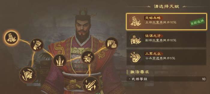 推荐路线:三军之众(提升穿透)→左右开弓(弓兵提升生命值)→强袭之阵(携带普攻阵法,提升普攻伤害)→一鼓作气(提升普攻伤害)→避其锋芒(主动技能抗性提升)/临危不乱(处于异常状态时降低受到伤害)→攻其不备(提升暴击伤害)→四海之内(作为主将,联盟外作战提升攻击)