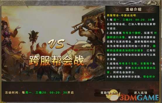 活动时间:每周一,三晚上20:00-20:30开启跨服帮会战,已加入帮会的玩家即可前往