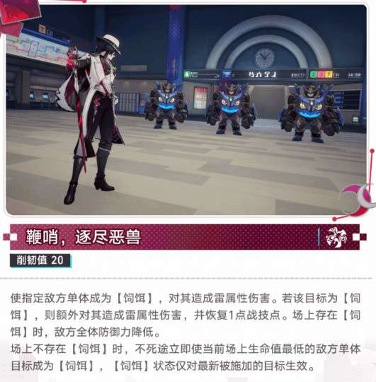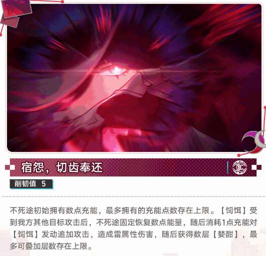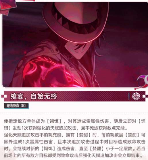3、终结技:造成500%攻击力雷伤并标记【饲饵】,获得2点充能,立即发动强化天赋追加攻击。