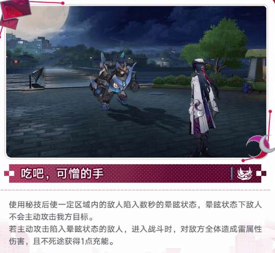 5、秘技:使区域内敌人晕眩,攻击晕眩敌人进入战斗造成100%攻击力雷伤并获得1点充能。