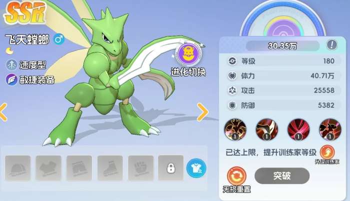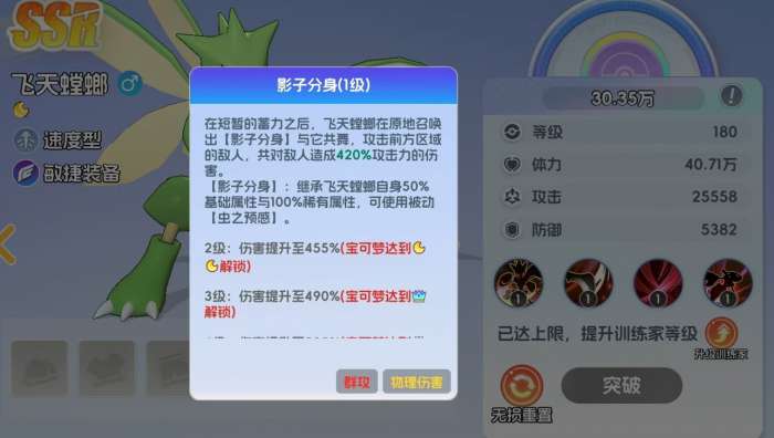 飞天螳螂在宠物集结里是速度型宝可梦,它可在怒气满后释放大招原地招出分身,并与分身一起对前方敌人进行协同攻击。所招出的分身在属性上会继承飞天螳螂50%的数值,且同样能获得飞天螳螂的被动虫之预感,可提升自身的攻击,并能在血量首次降至50%时,进入无敌状态1秒钟的时间。等飞天螳螂到达11级时,还可解锁新技能电光一闪,该技能可让飞天螳螂立刻突进至敌方后排宝可梦面前,并对其造成爆发伤害,且使用该技能时若出现了击杀敌方宝可梦的情况,还能立刻刷新再次使用。若飞天螳螂的等级达到了41级,还能再解锁连斩技能,可挥动前肢对敌方进行多段斩击,且释放期间自身会获得9999点闪避提升,几乎不可能会敌方击中。