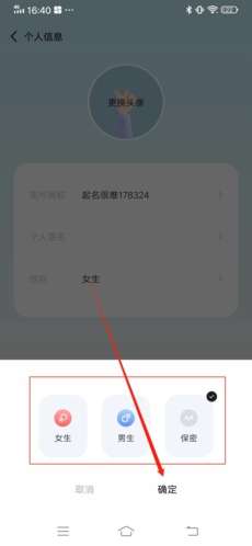 4、在弹出窗口中,我们可以自由的选择女生、男生和保密,选择完毕后的,点击确定,即可成功修改性别。