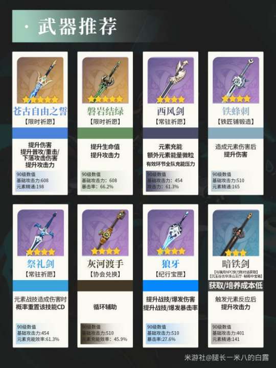 武器: 苍古,磐岩结绿,西风剑,铁蜂刺(锻造),祭礼剑,灰河渡手,狼牙(纪行),暗铁剑