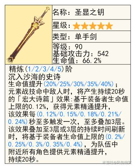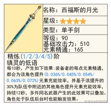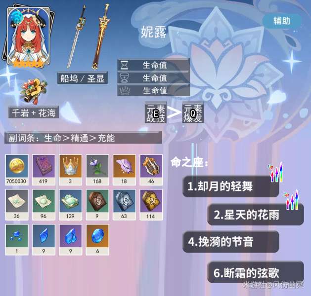 【妮露】开E后可以根据生命值高低提高精通,加强绽放!!不管是前台的EAAA还是后台的EEEE都能完美触发全部特效,同时也辅助了整个队伍的精通!这把武器的强度,推荐有妮露必抽。