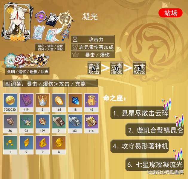 按住方向键并同时按下A键三次,可以积攒三颗星璇,再按下重击键就能释放星璇,并在释放时获得突破1的效果,而且不会消耗体力。同时,按住方向键和不按住方向键会影响凝光普通攻击的速度,需要自己亲身尝试才能感受到。最后提醒,不要在原地普攻,这样会浪费时间。