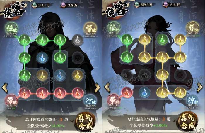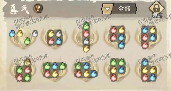 主要分为攻击百分比(绿)、生命百分比(黄)、暴击率(红)与暴击伤害(蓝)4个词条属性,单个真气最高有6个穴位。直线连线成功即可激活属性。