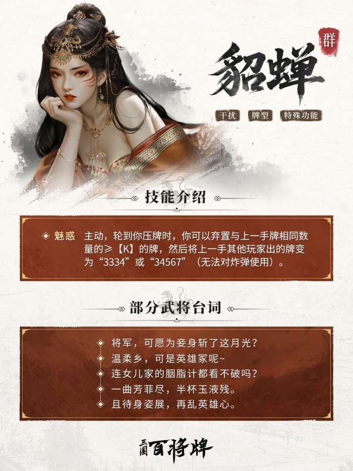 2、技能简介:貂蝉凭倾城之姿行连环妙计,智除国贼,以柔克刚。这份“以美为刃、改牌控局”的奇谋,在《三国:百将牌》中化作主动技能【魅惑】。